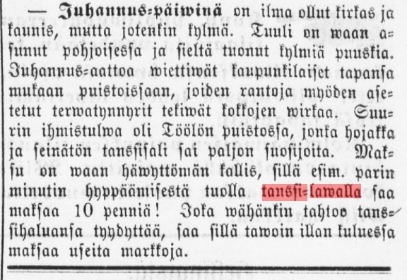 Sanomalehdessä Uusi Suometar mainitaan tiettävästi ensimmäisen kerran suomenkielellä sana tanssi-lawa vuonna 1874. Mikkelin tansseista on maininta Uusi Suometar -lehdessä vuodelta 1879, missä kerrotaan Mikkelin ”wapaehtoisen palosammutuskunnan” juhlista: ”soittokunta oli tilattu Wiipurista, juhlakenttä oli mukawasti warustettu puhe-, soittokunnan- ja tanssi-lawoilla, telttilöillä sammutuskunnan joka osastoa warten, ravintolalla y.m.”